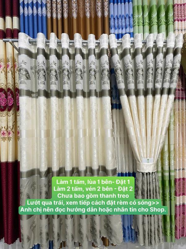 Rèm cửa cản sáng 90%,vải 3d bông hoàng gia dài màu xanh biển,kiểu may xỏ khoen,giá trong giỏ hàng đang tính là m căng thẳng chưa có độ nhúng,chưa gồm thanh treo rèm.