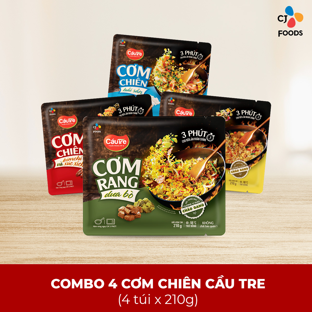 [Tặng 2 Mandu ăn sáng] Combo 8 cơm chiên Cầu Tre 210g x 8 (Hải sản x2, Dưa bò x2, Gà cháy tỏi x2, Kimchi xúc xích x2)